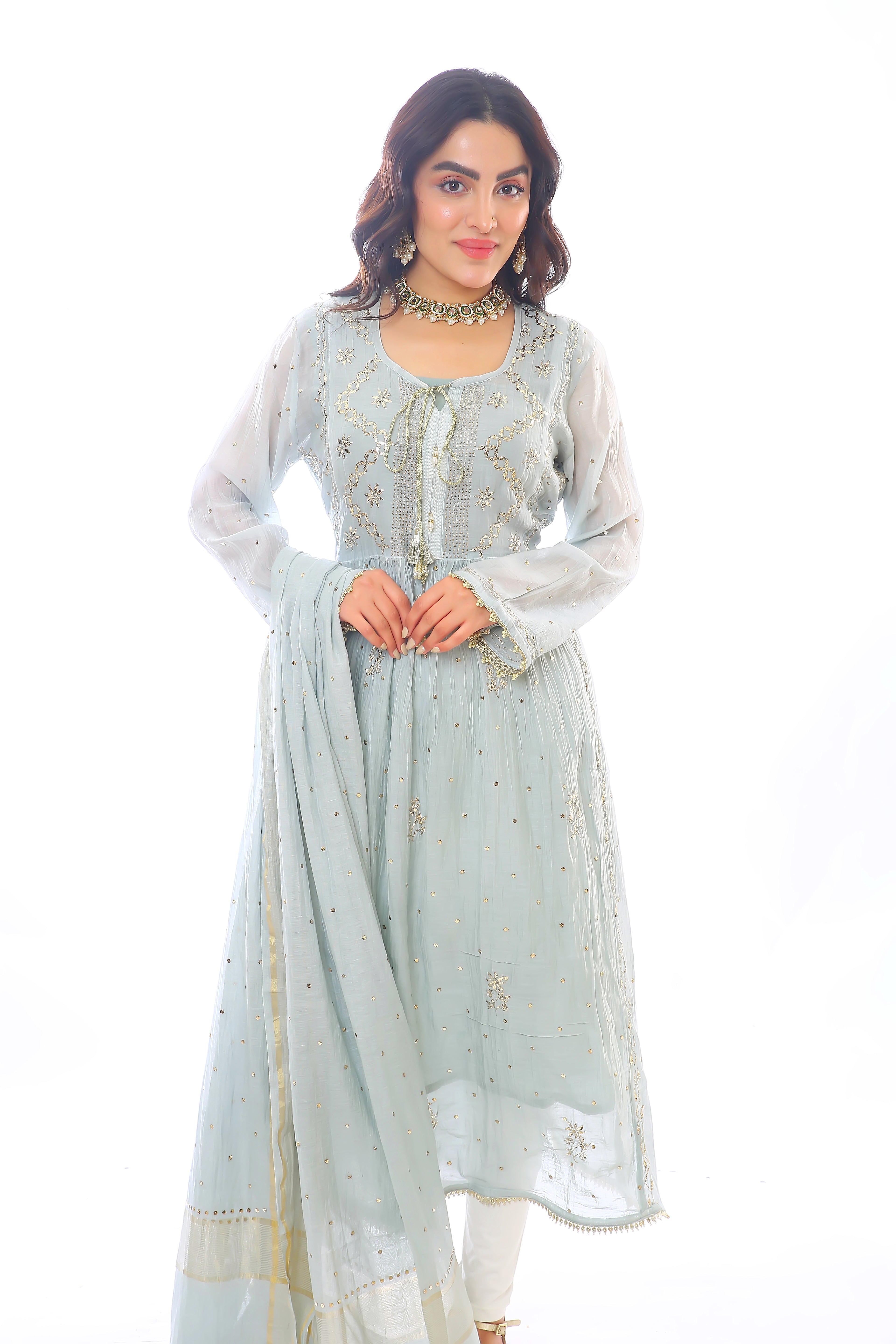 A whisper of grace in every thread— Crafted in pure mul chanderi, the Haya Set is a 48-inch silhouette adorned with intricate badla and mukash hand embroidery. The kurta features delicate handmade pearl tassels, paired with coordinated straight pants and a fully embellished dupatta that glimmers softly with every step. Perfect for intimate celebrations or festive gatherings, this ensemble is a celebration of quiet luxury.