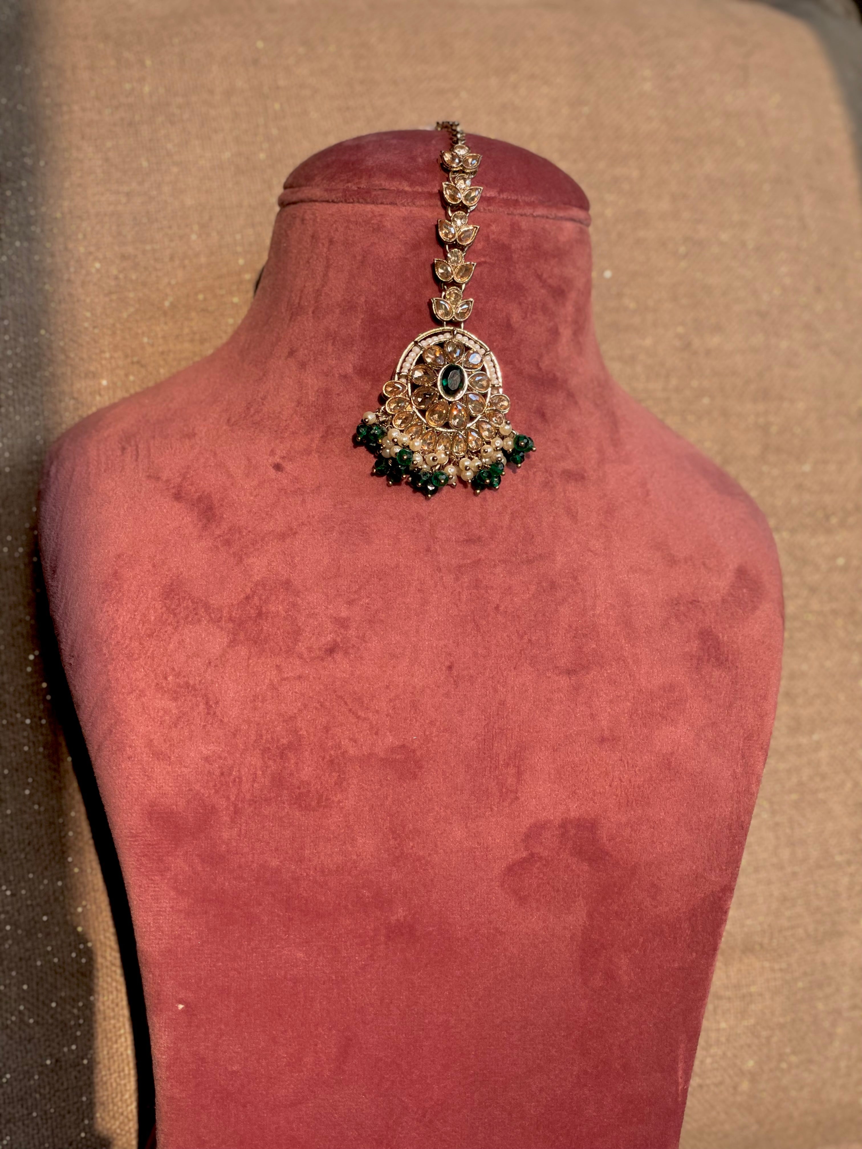 A kundan tika with soft green accents, symbolising freshness & subtle elegance.