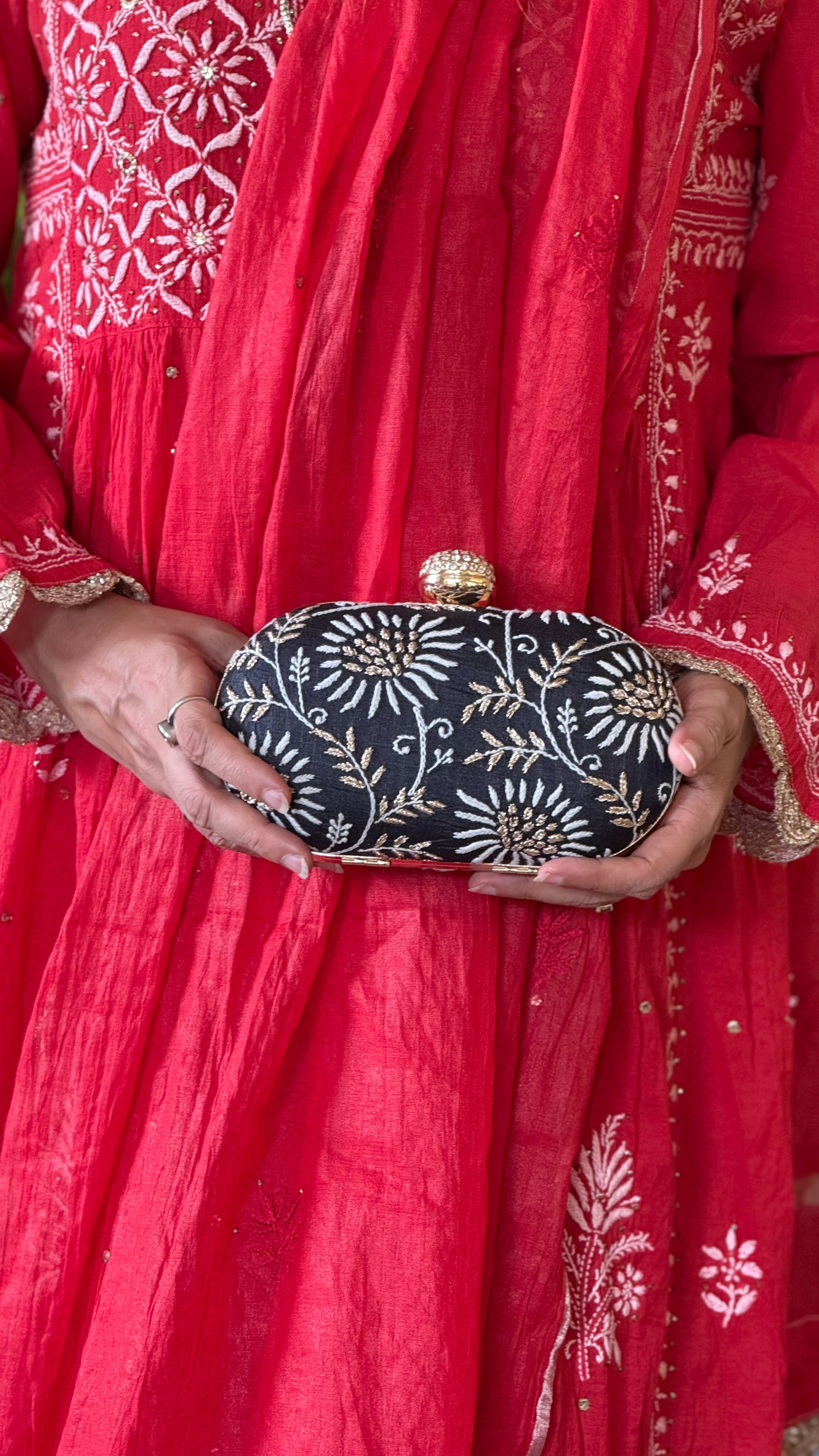 Black Ameera Clutch With Lucknawi and Zari Emroidery