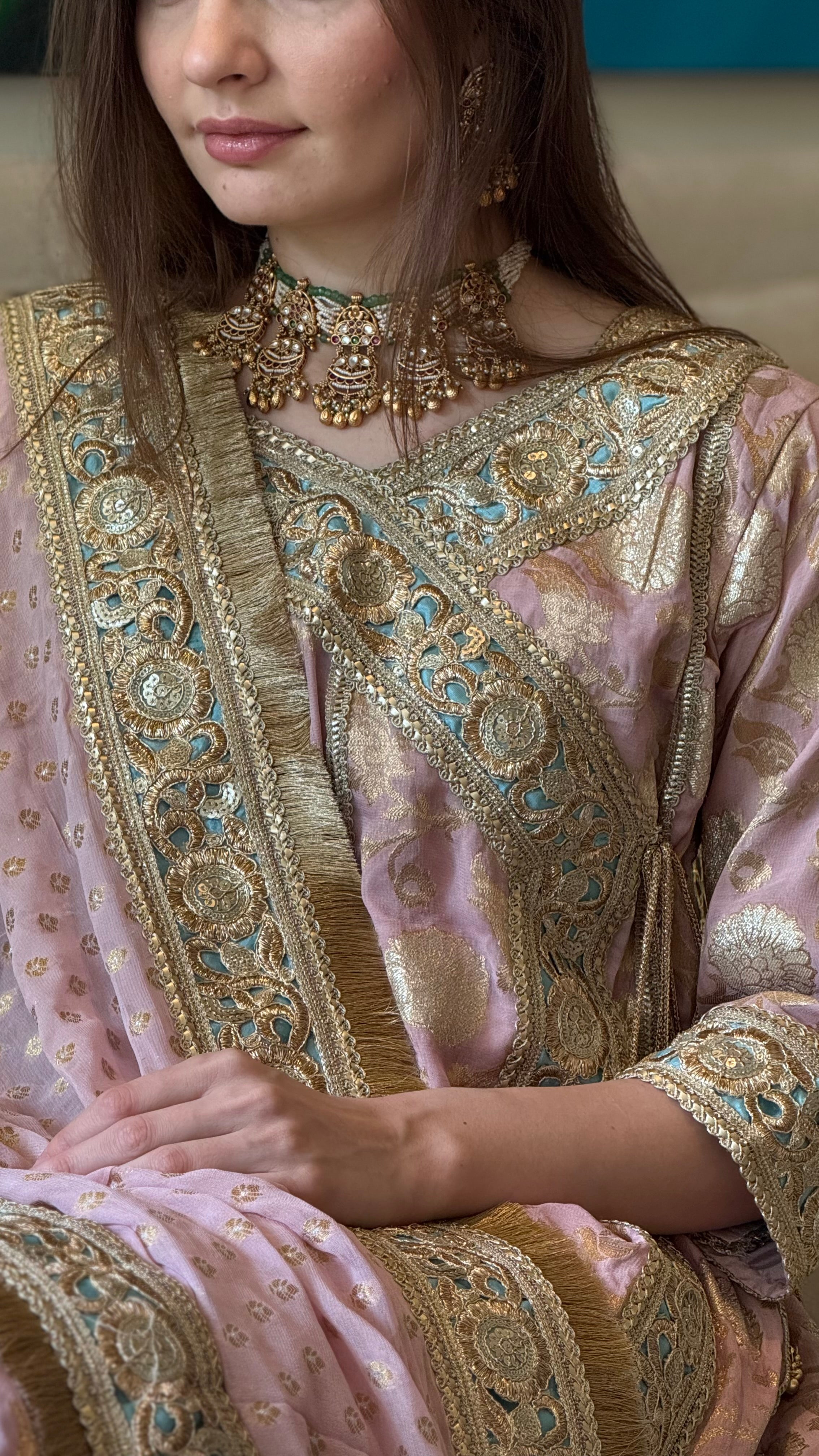 Pink & Teal Hamida Angarkha Set – A royal ensemble crafted in fine Banarasi silk, featuring a graceful Angarkha silhouette with intricate hand-embroidered border. Paired with a rich dupatta and complementing brocade pants, it blends traditional elegance with timeless sophistication.