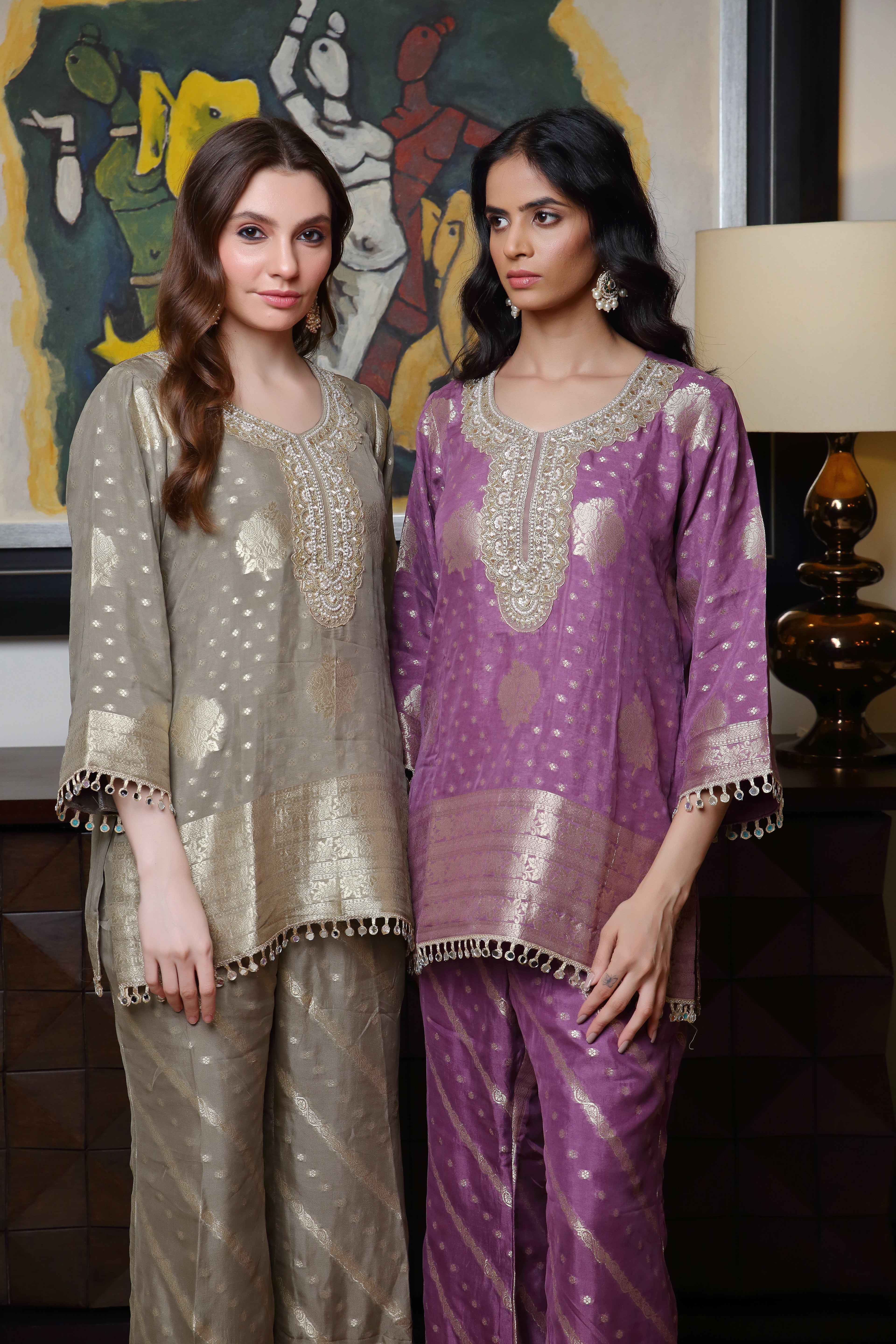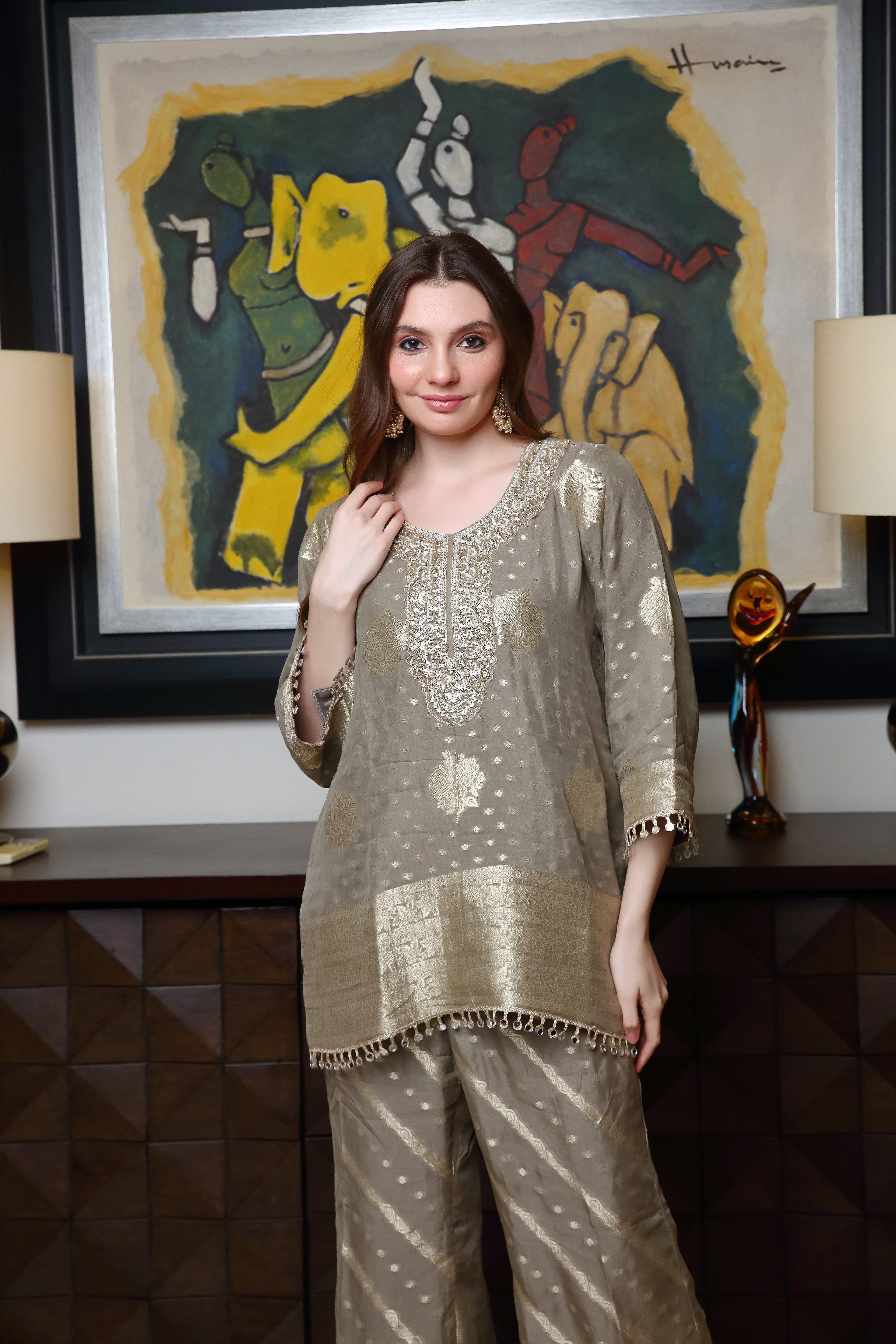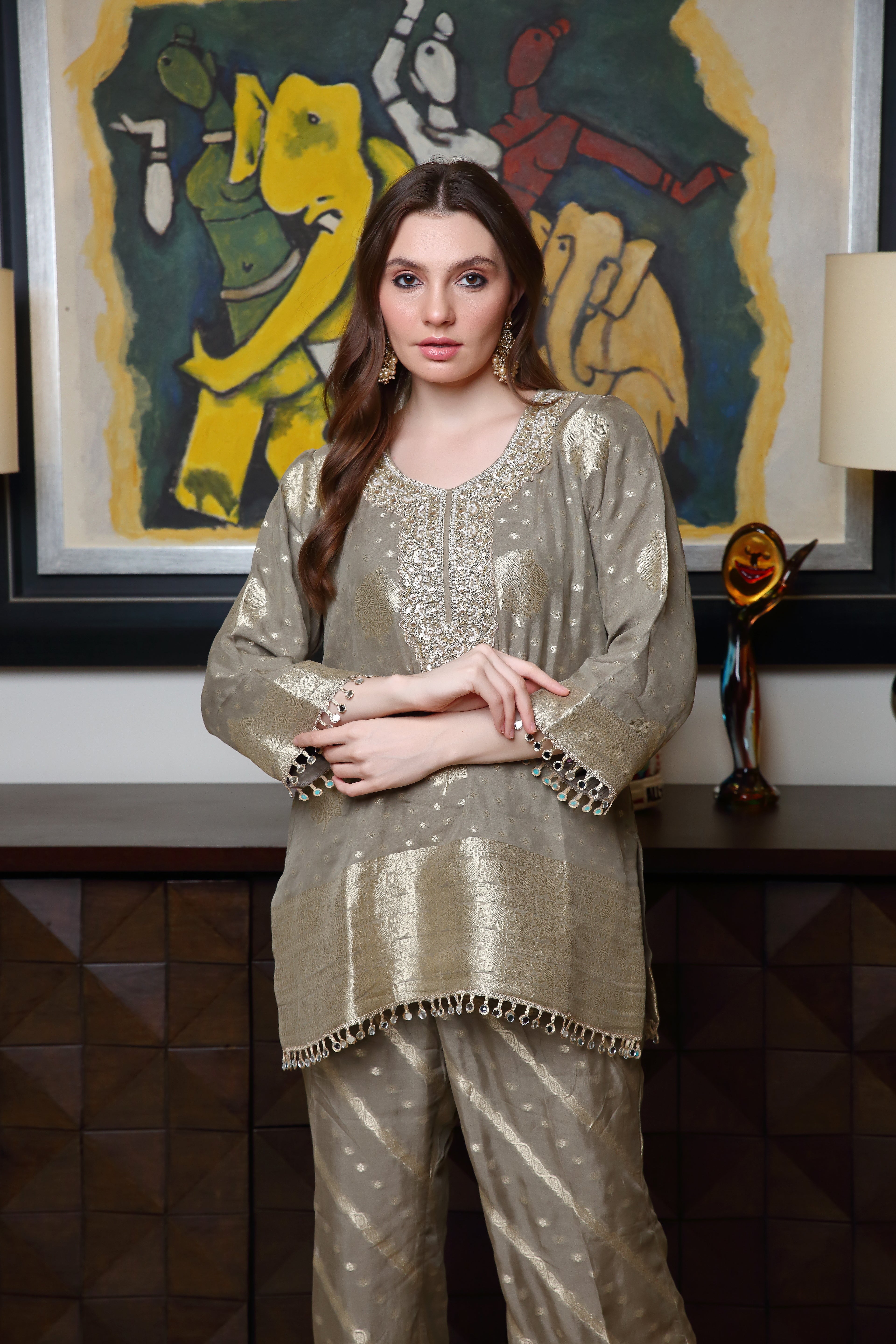 The Riya Banarsi- olive brings together timeless tradition and modern elegance. This georgette banarsi co-ord set is fully lined for comfort and flow, designed to elevate your festive and formal looks. The kurta features a beautifully hand-embroidered yoke with intricate detailing that adds richness to the silhouette. Paired with straight pants, the ensemble’s subtle sheen and banarsi weave create a regal yet versatile statement perfect for celebrations or refined gatherings.