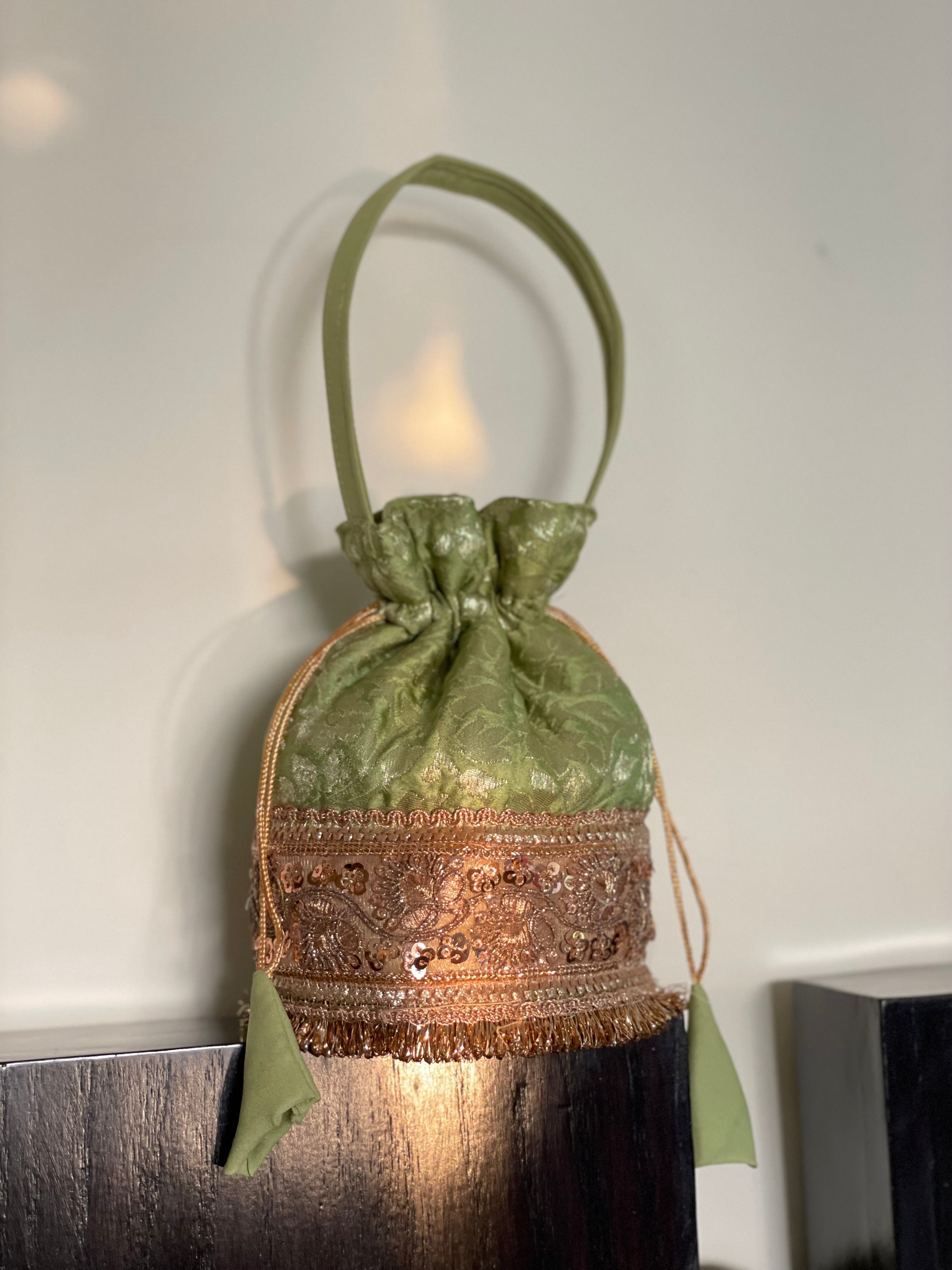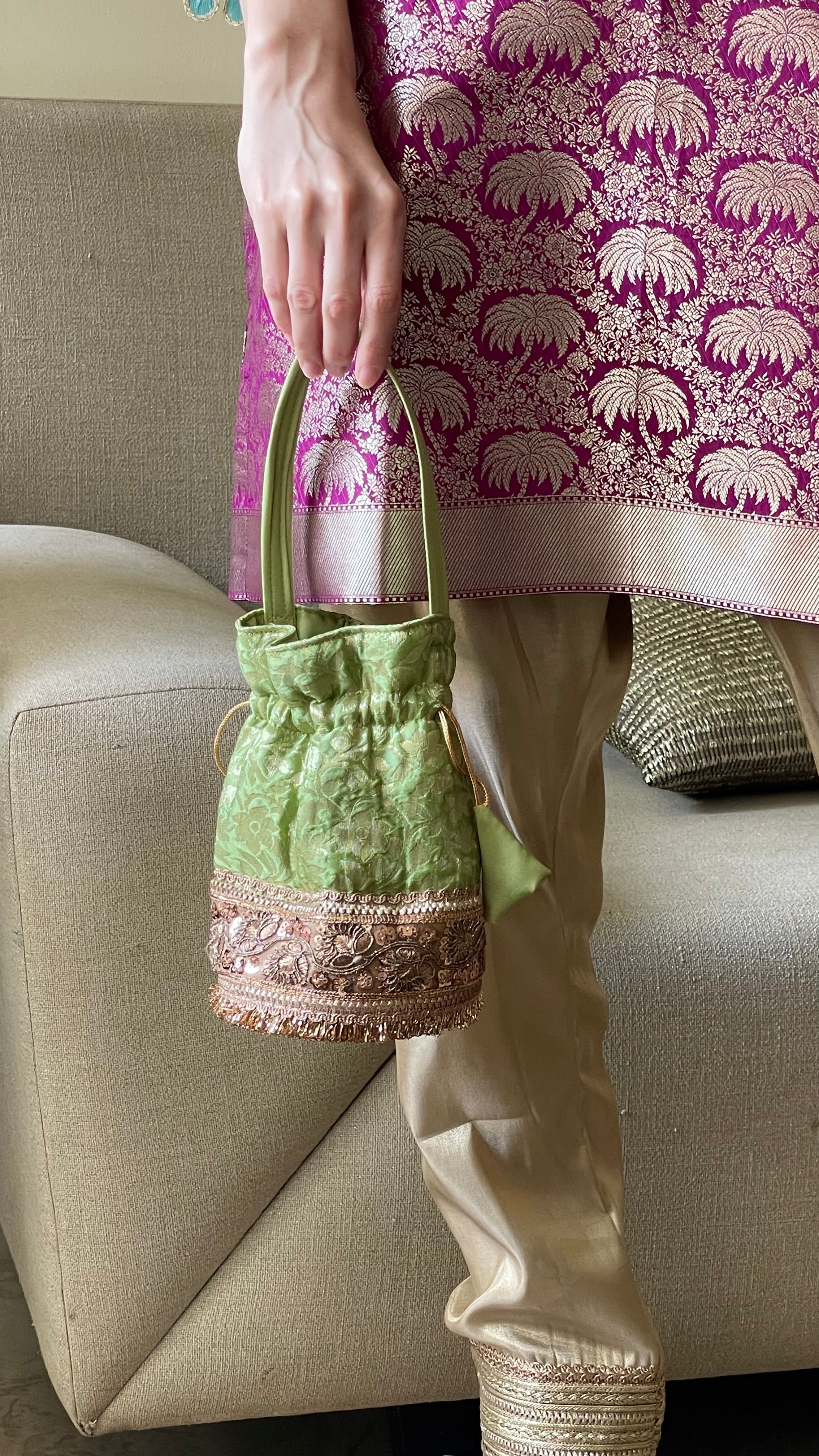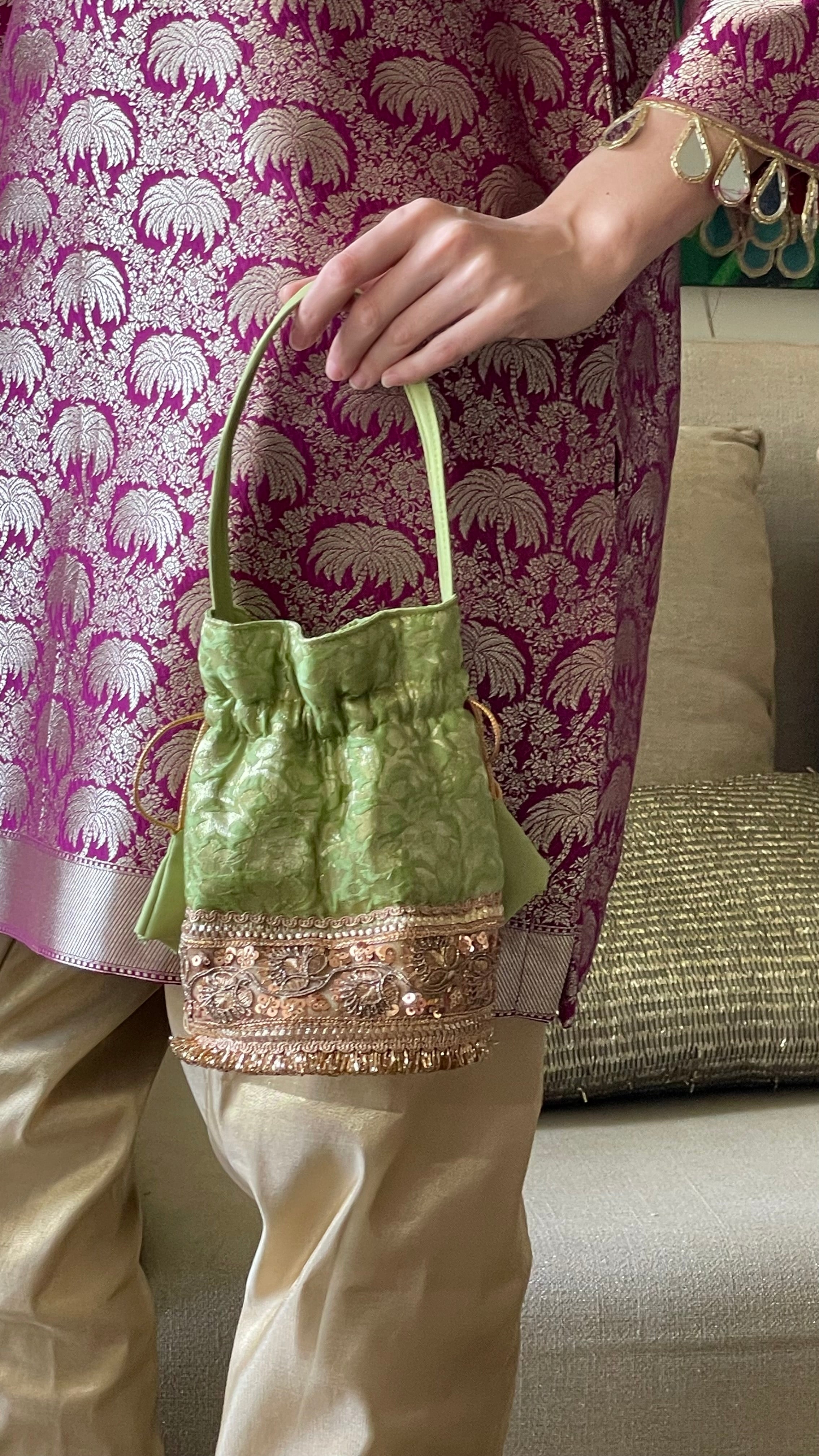 Charminar Potli – A luxurious Banarasi silk potli bag beautifully adorned with a shimmering gota border. Finely handcrafted, this elegant accessory perfectly blends traditional craftsmanship with a modern silhouette, making it an ideal companion for weddings, festive occasions, or evening celebrations.