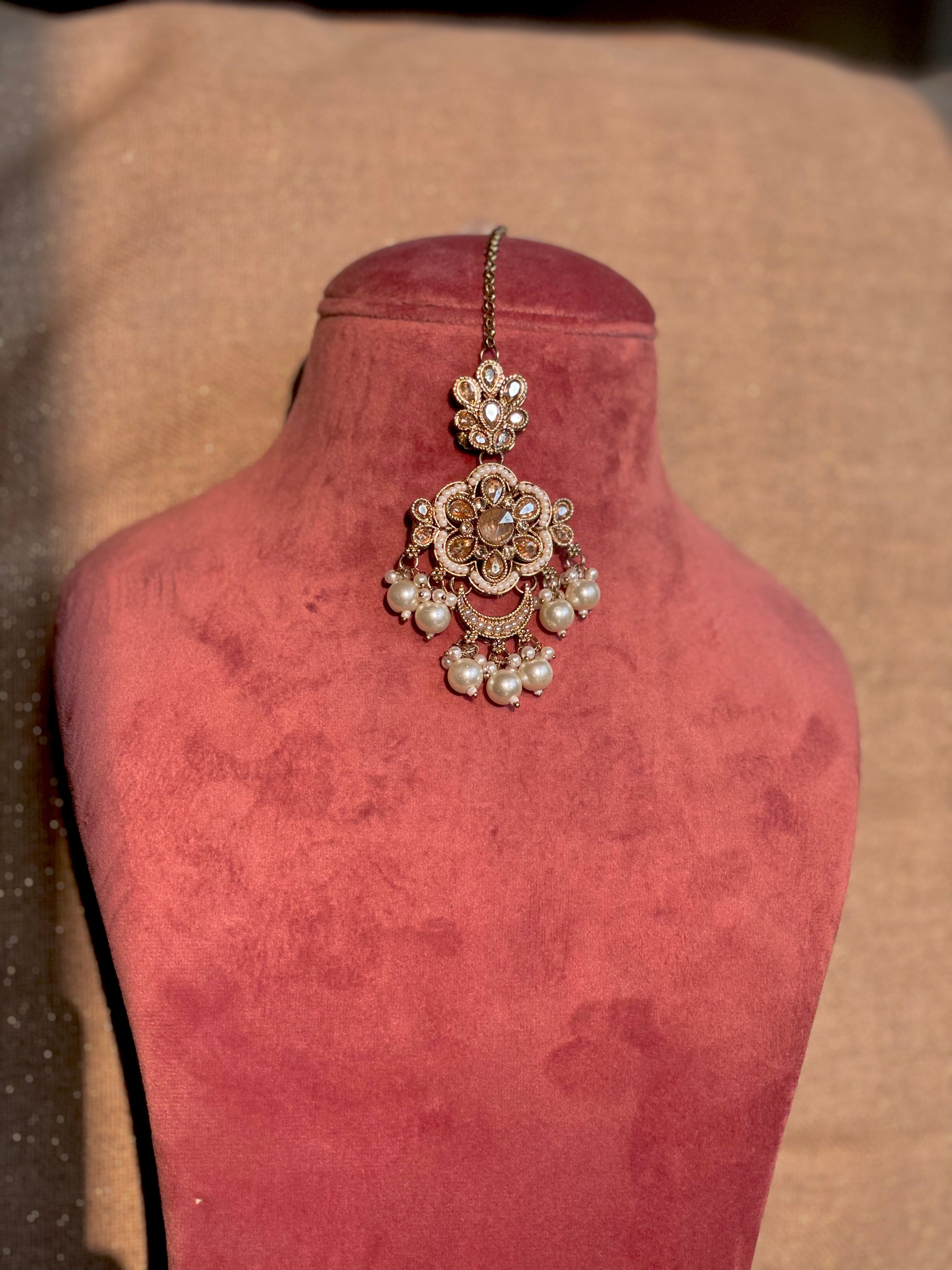 A floral inspired tikka with pearl detailing, delicate yet striking like a star adorning your look.