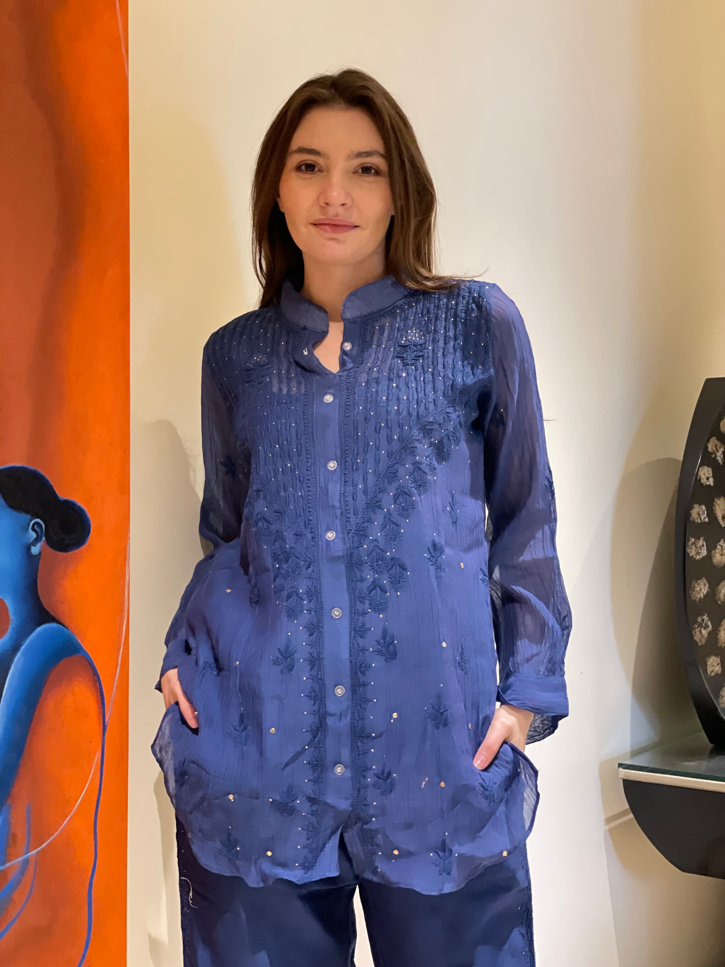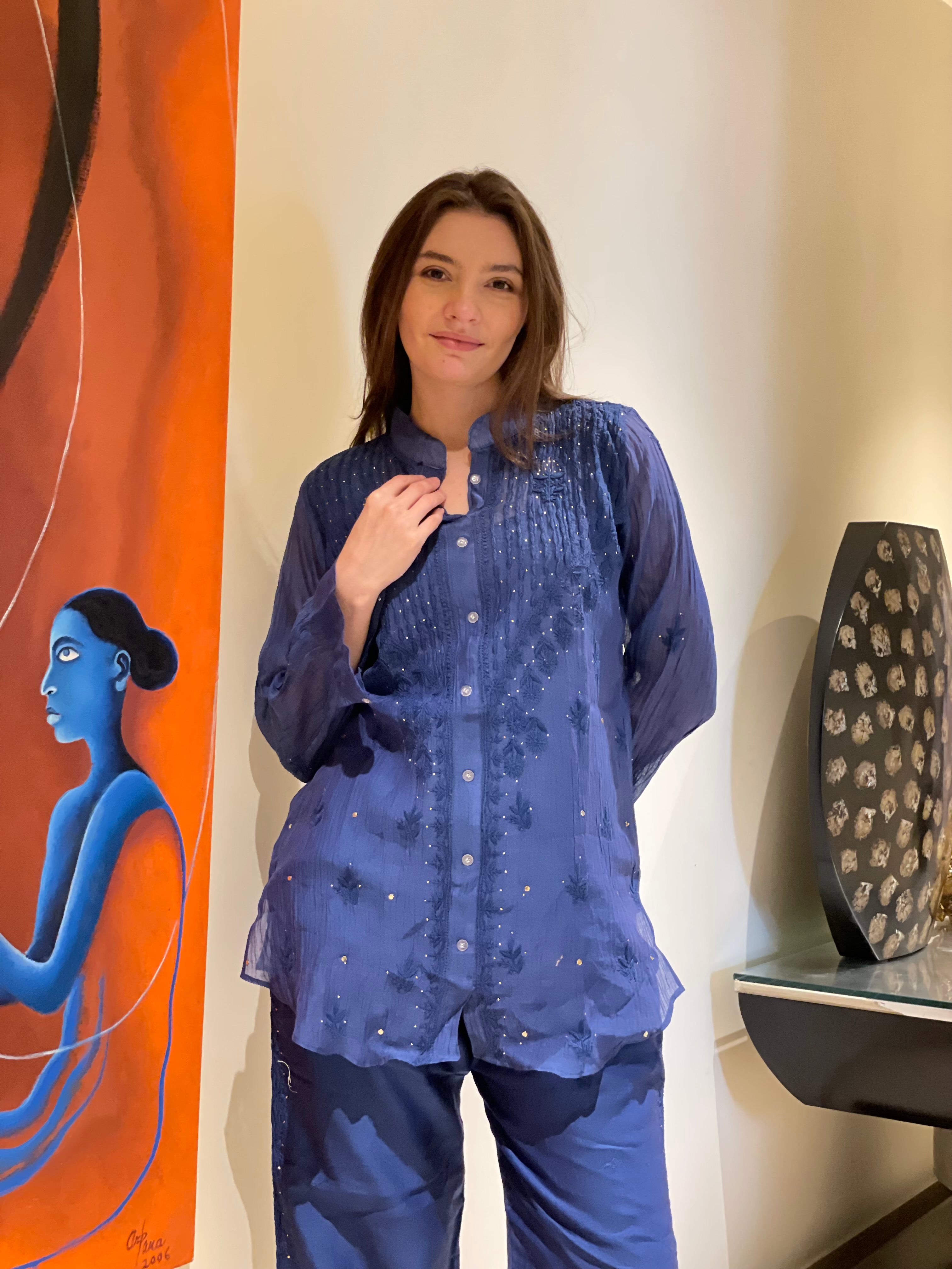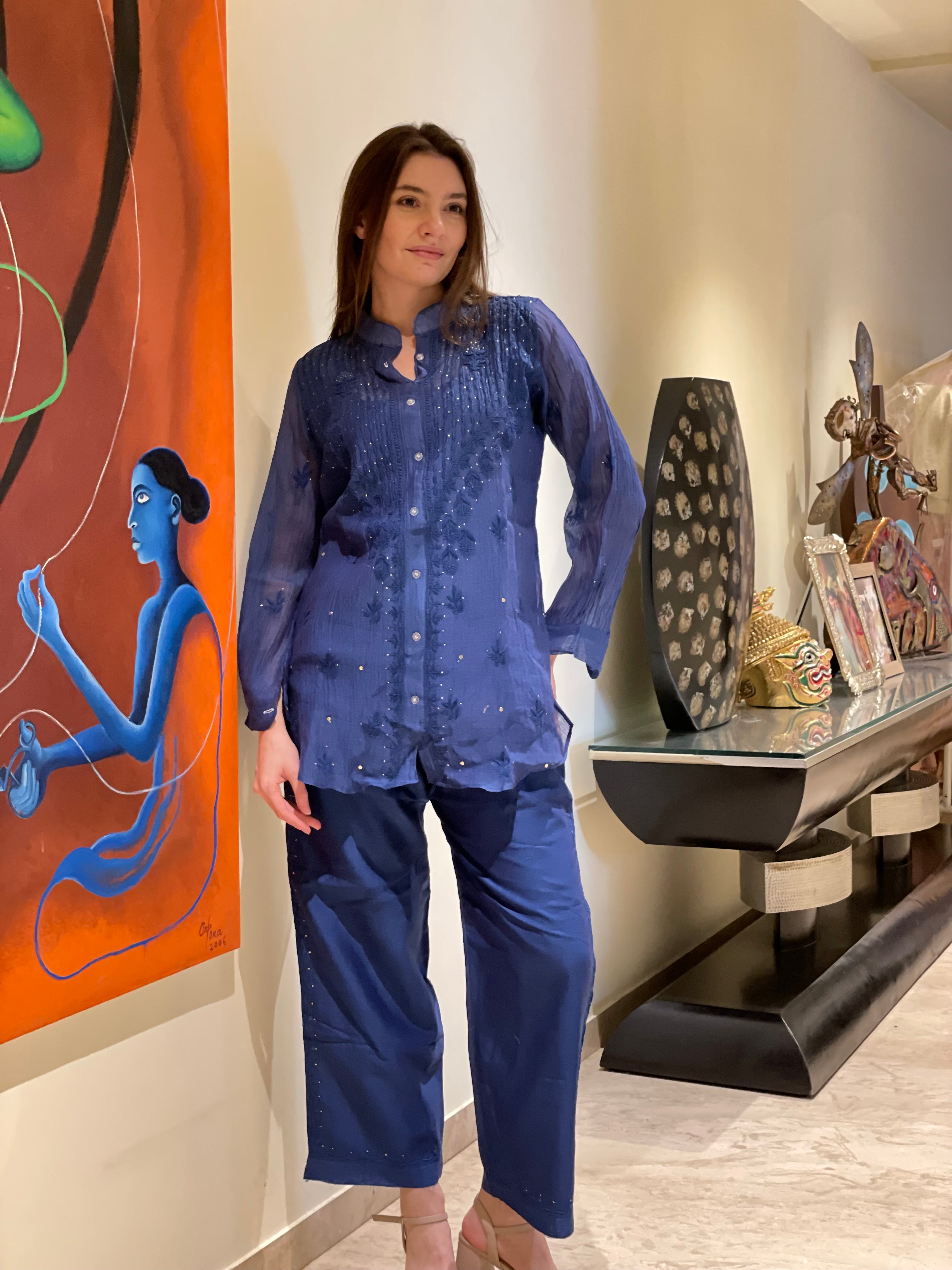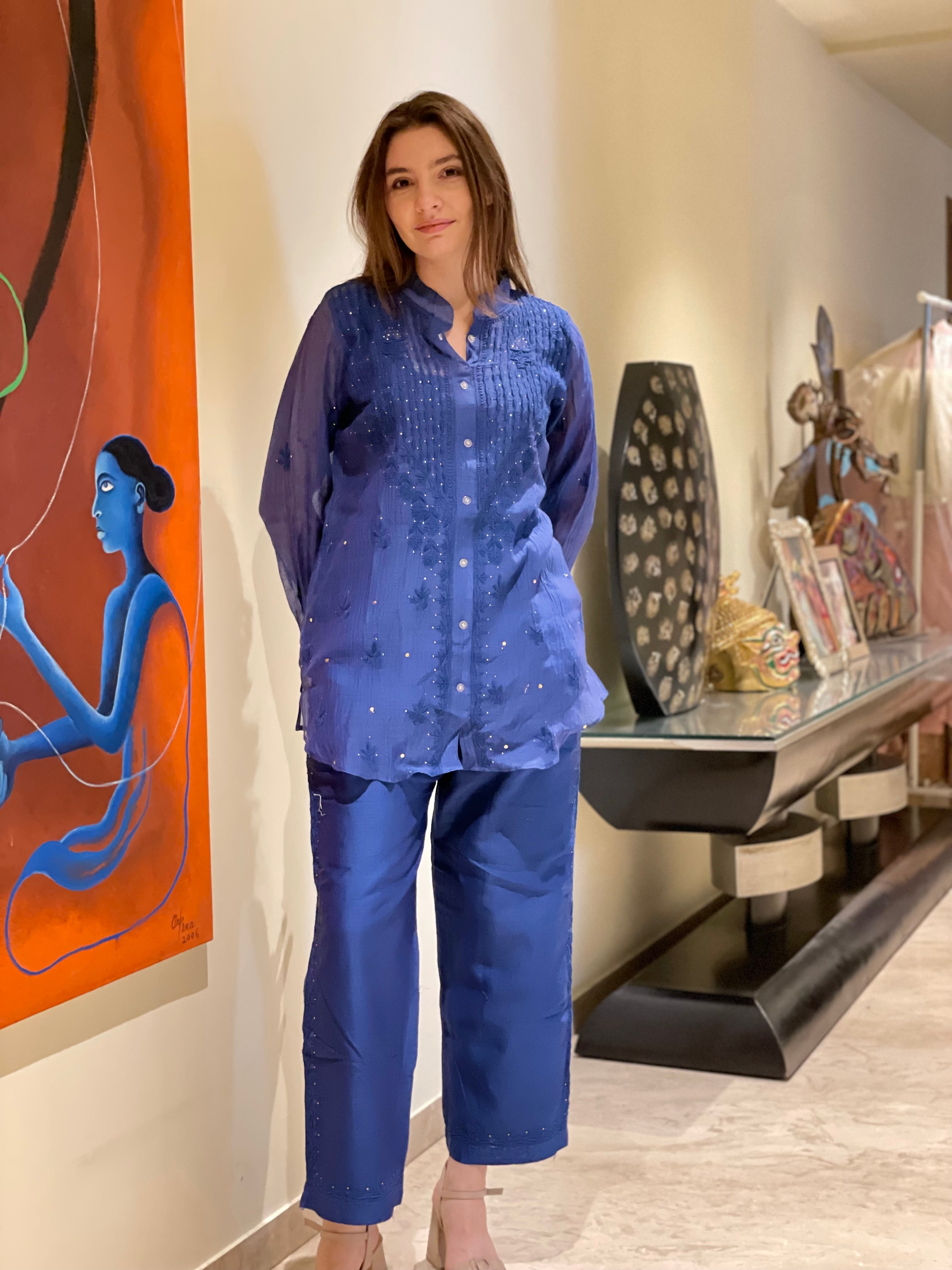 Kajal Co-ord Set – Crafted from pure Mul Chanderi, this elegant ensemble features delicate Lucknawi embroidery highlighted with subtle mukaish work. Its timeless design and airy texture make it perfect for festive gatherings, celebrations, or elegant daytime occasions.